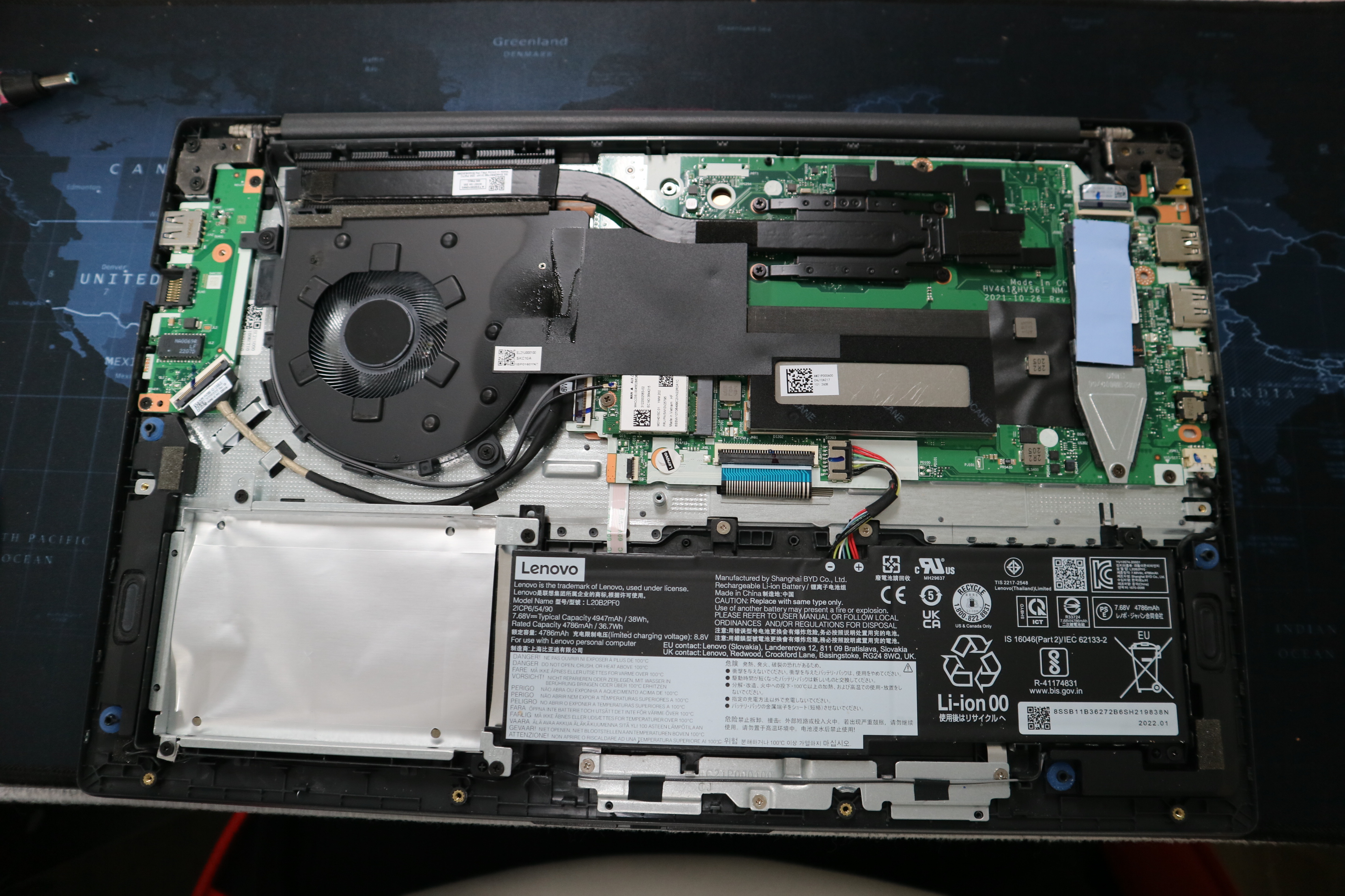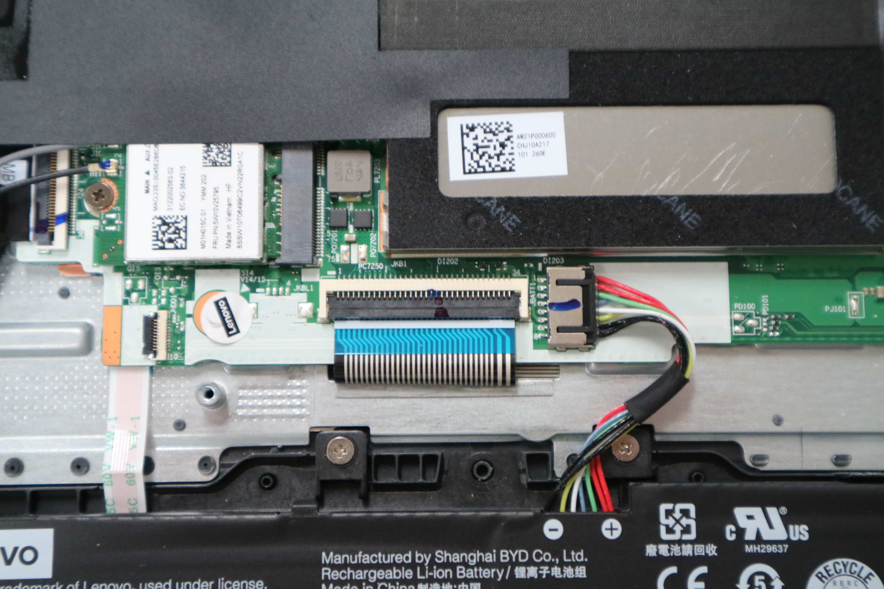 노트북 하단의 스티커를 통해 제품 정보를 확인해보니, 정확한 모델명은 Lenovo V15 G2 ALC, 제조일은 2022년으로 확인되었습니다. 또한 내부 확인을 위해 상단 베젤과 하판을 분해한 뒤, 케이블 및 커넥터 상태까지 점검하였습니다.
